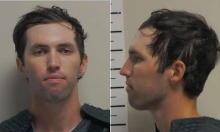 Tyler Robinson in a pair of mugshot photos, showing his portrait and profile. he has brown hair, hazel eyes, and a clean shave